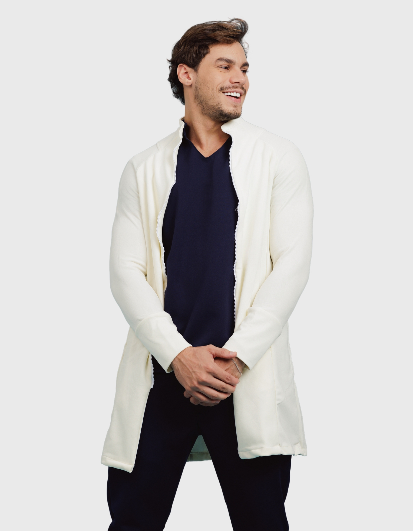 Jaleco Masculino Adam é um modelo de jaleco diferenciado, de modelagem ajustada e caimento perfeito, trazendo um visual moderno para seu look do dia-a-dia.