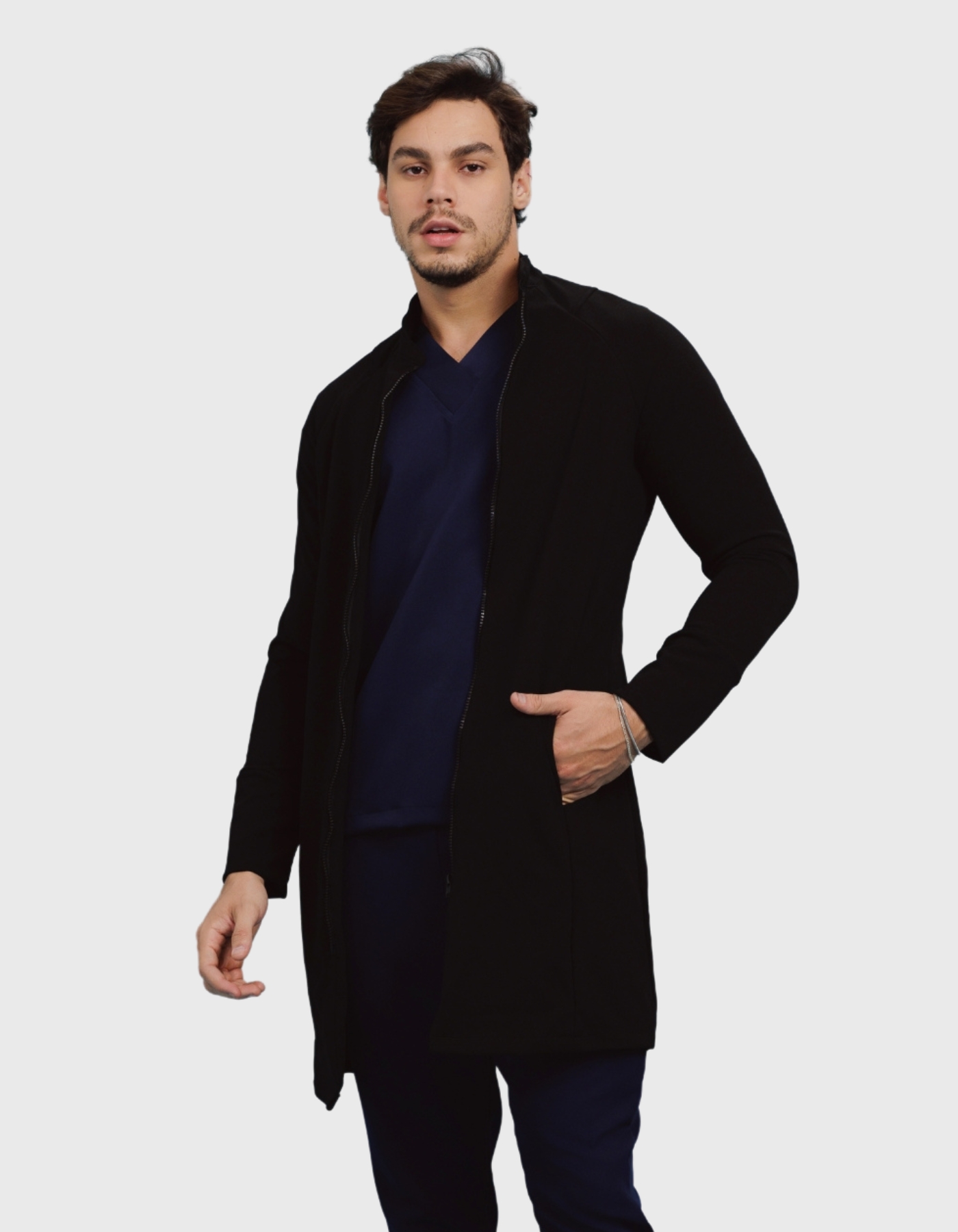 Jaleco Masculino Adam é um modelo de jaleco diferenciado, de modelagem ajustada e caimento perfeito, trazendo um visual moderno para seu look do dia-a-dia.